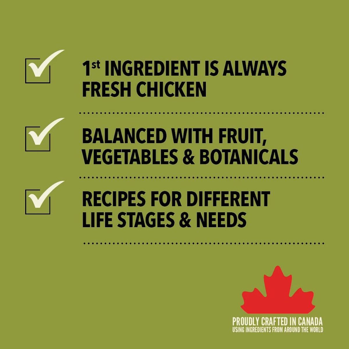 - El primer ingrediente es pollo canadiense fresco. Nuestros ingredientes frescos utilizan la refrigeración como único método de conservación y nuestros ingredientes crudos se congelan en su máxima frescura.