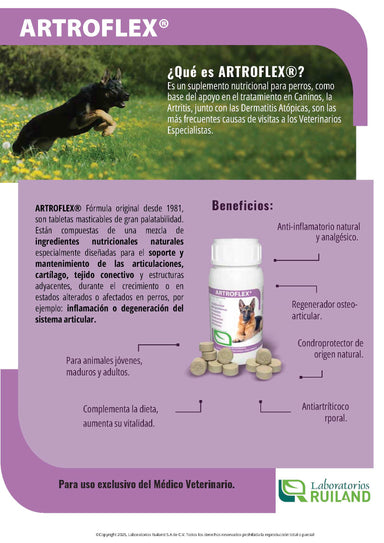 27Artroflex® de Laboratorios Ruiland® es el suplemento original para perros que desde 1981 cuida la salud de las articulaciones, cartílagos y tejidos...