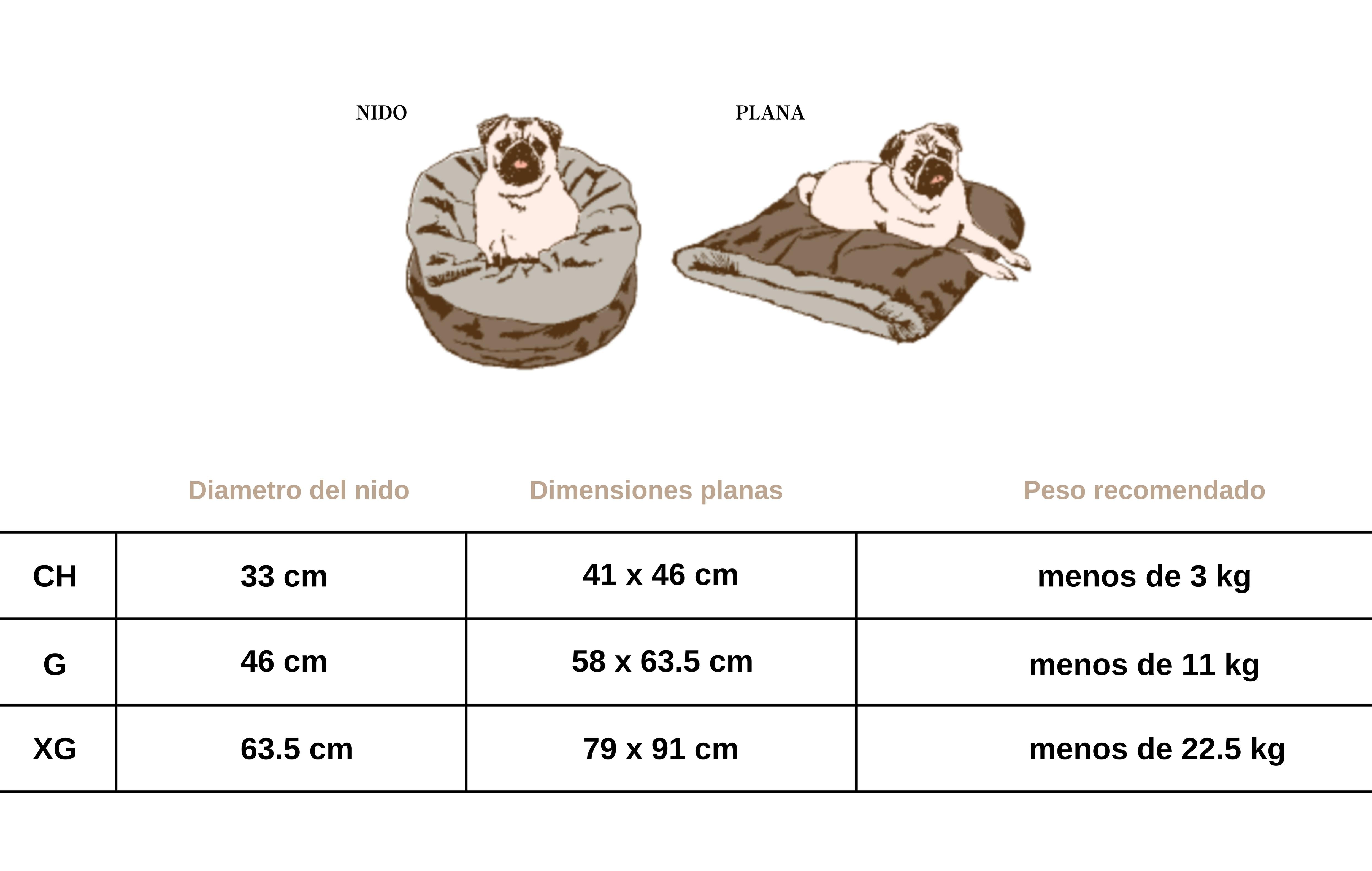 Ten en cuenta que las recomendaciones de peso deben considerarse orientativas. Con tantas razas y tipos de cuerpo diferentes, lo mejor es pensar en las dimensiones teniendo en cuenta el estilo de dormir favorito de tu mascota y medir a tu mascota mientras duerme cómodamente para obtener el mejor ajuste. En caso de duda, recomendamos pedir una talla más.