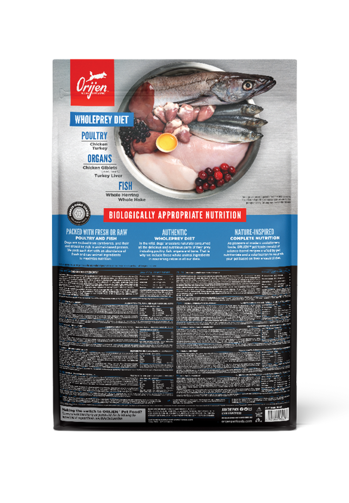 Por esa razón, usted no encontrará largas listas de suplementos sintéticos en los alimentos para perros ORIJEN. Colmado con abundantes proporciones de carnes frescas de aves de corral, órganos, además de pescados y huevos enteros y frescos. ORIJEN aporta una fuente natural de prácticamente cada nutriente que su perro necesita para crecer saludablemente.