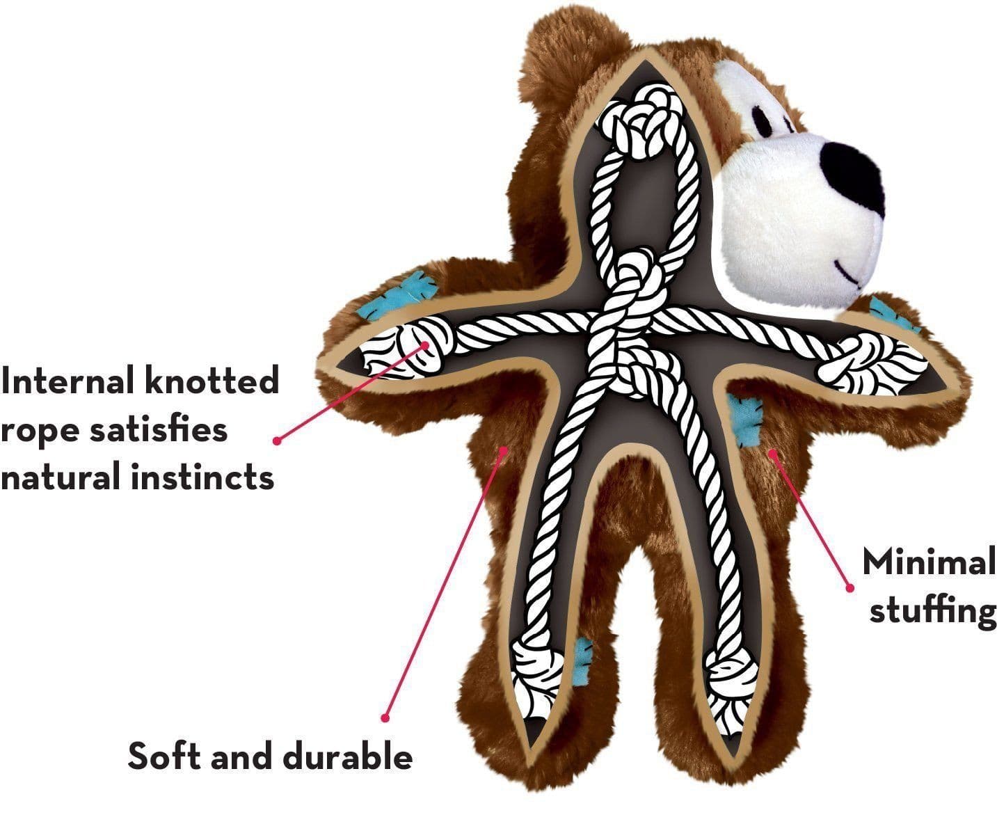 Los Kong Wild Knots son los peluches más tiernos y clásicos. Con detalles divertidos como parches y sus caras animadas es difícil recordar lo resistentes que son. El interior de cuerda super resistente y el sonido Squeaker cuando lo apachurras lo cual satisface el instinto natural de cacería de tu perro dandole vida a este resistente peluche. Además contiene solo el relleno suficiente, tiene lo menos posible para que le logre sacar lo menos posible.